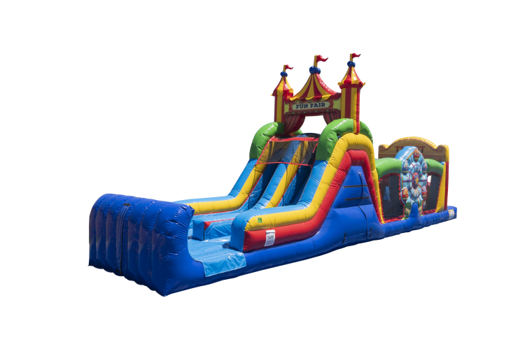 Tackle a colorful carnival-themed challenge with this versatile Wet/Dry Obstacle Course. Designed for races, parties, fundraisers, and friendly competitions, the course features a series of inflatable obstacles that test speed, agility, and balance as participants crawl, climb, dodge, and sprint to the finish. Its dual wet or dry setup lets you choose a splash-filled experience with water for hot days or a traditional dry run for all-weather fun. Bright, carnival-inspired colors and playful styling add festive flair to any backyard, park, or event space.